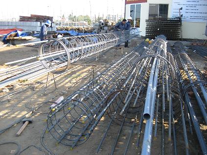 – Căn cứ vào bản vẽ thiết kế để gia công thép cho cọc. – Con kê: Là phụ kiện bằng thép bản hoặc Xi măng – Cát (hình tròn) dùng định vị lồng thép trong lỗ khoan. Chiều dày lớp bảo vệ là 50 mm – Số lượng con kê cần buộc đủ để hạ lồng thép chính tâm. – Nối các đoạn lồng thép chủ yếu bằng dây buộc, chiều dài nối theo quy định của thiết kế. Khi cọc có chiều dài lớn, cần phải nối bằng Bulon đảm bảo đoạn lồng thép không bị tụt khi lắp hạ.
